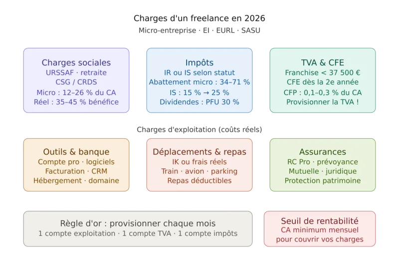 Charges freelance 2026 : URSSAF, impôts, TVA, CFE et assurances